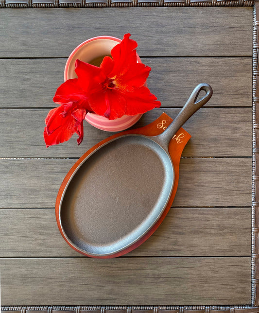 Personalized Oval Pine Wood Underliner for Cast Iron Skillet with Handle Mahogany Finish